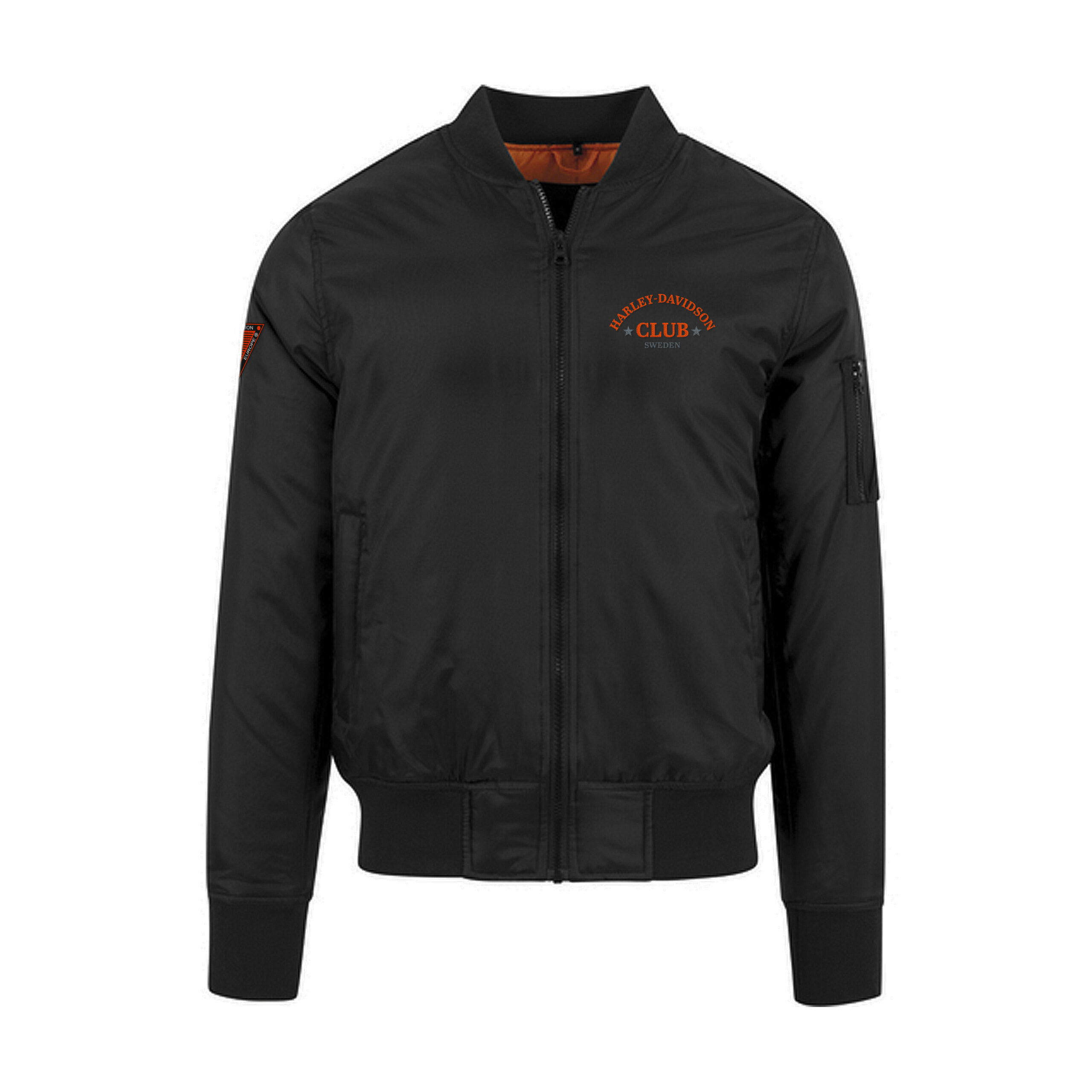Brodyr: Harley-Davidson Club Sweden på vänster bröst, federationmärke på höger ärm.
